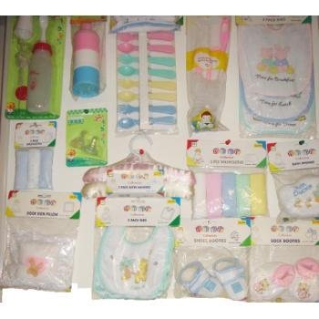 Random assortment of baby items. Your order will include 12 each of 8 different individually wrapped products, such as bottles, feeding kits, spoons, booties, and bibs. Colors will be assorted to include colors for both boys and girls. Cost is per piece. This photo is a representation of the assortment, and styles shown may or may not be included in the shipment.