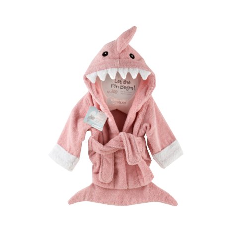 Start her off with some essential (and adorable!) inspiration. Features and facts: Pink terry robe with white cuffs, two terry ties in front, a hood with smiling, white shark's teeth, appliqued black eyes and a dorsal fin accent. Bottom of robe resembles a shark's tail. Sharks can be personalized with baby's name for an additional cost. Machine-wash and dry (low). Size 0-6 months.