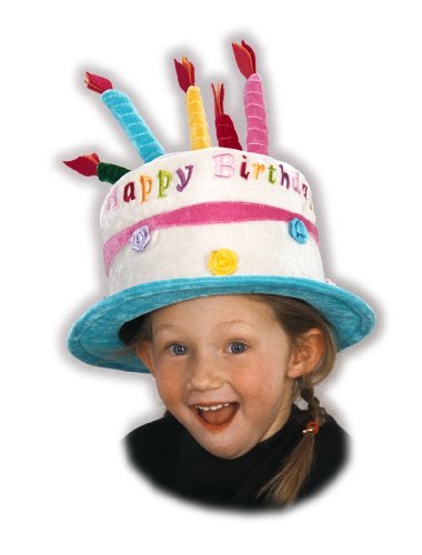 Feel special wearing something that tells everyone that it is your special day! Costume suggestion: birthday girl or boy. Fabric lining, secret pocket with fortune. Velcro size adjuster. Velvet.You say it's your birthday? Well, what could be sweeter than a beautiful frosty-white birthday cake--that you wear on your head?! That's right, there will be no mistaking the birthday girl when this hat is tossed into the ring. The white cake has pink frosting, multicolored flowers, and five big yello