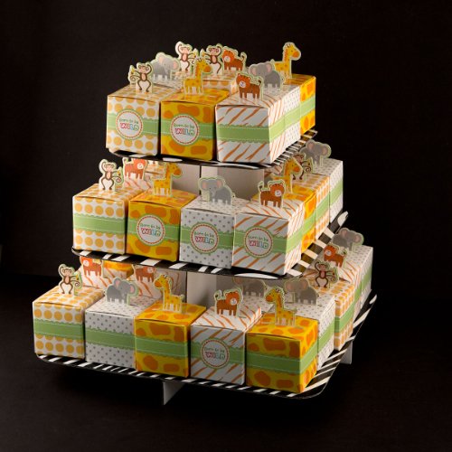 You will find Kate Aspen's herd of cute critters full of fun. In stripes and spots, our jungle tots are on their way to your baby shower, where they'll bring a box full of sweetness and your heartfelt thanks to each and every guest. Features four baby jungle themed favor boxes, each one celebrating a different, adorable baby animal a monkey, a tiger, an elephant and a giraffe with a different design to represent the animal on each box. A cut out of an animal tops each box. Box decoration include