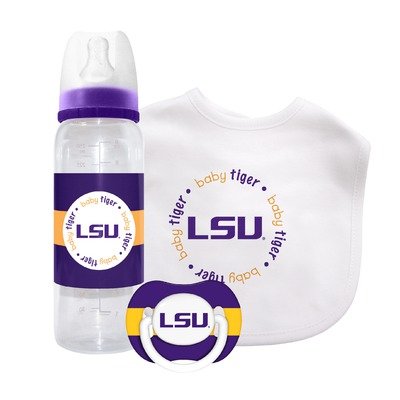 812799014423 NCAA Team: LSU Features: -Authentic NCAA team league.-BPA and phthalate free.-Bib is 100pct cotton.-Closure and embroidered logo.-Bottle is dishwasher safe.-Made in China. Includes: -Set includes a bib, a bottle, and a pacifier. Dimensions: -Dimensions: 8.5'' - 9'' H x 7'' W x 3'' D.