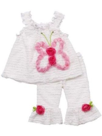 White sleeveless top with rows of chiffon eyelash ruffles and pink 3-D rosettes forming a butterfly on the front, over white eyelash ruffle capri with 3-D rosettes and ruffles at hem 2pc set by Rare Editions. Button-back closure.