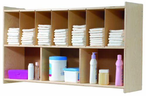 Wall unit stores changing table supplies. Unit has seven compartments on top and three on bottom. Sturdy glue and dowel construction. Tough clear uv finish.