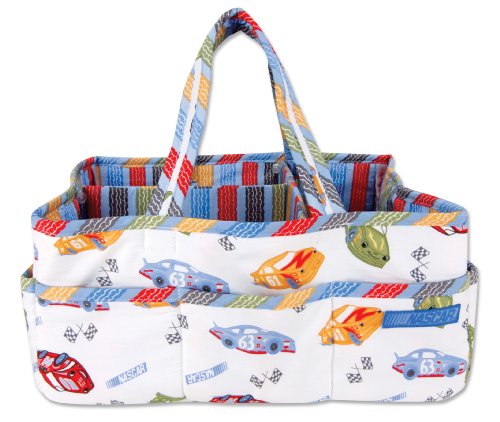Add organization to any area of your home with this Nascar portable Storage Caddy by Trend Lab. This lightly padded caddy features a red hot, cornflower blue, sky blue, mango orange, olive, charcoal and white race car and checkered flag scatter print outside with a coordinating tire tread stripe print throughout the inside and trim. Caddy has 8 outer pockets and a removable "T" separator for maximum versatility. Keep diapers, wipes and other necessities tidy while traveling from room to ro